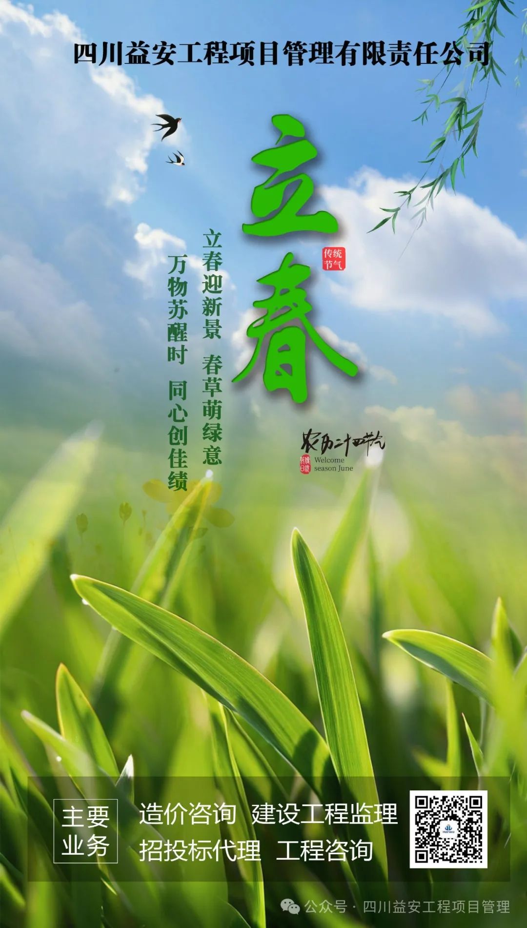 立春已至,万物复苏,四川益安工程项目管理有限责任公司全体同仁,迎来了充满希望与挑战的新篇章。在这个充满生机的季节里,每一缕春风都是对我们不懈努力的殷切召唤,每一抹新绿都是对我们创新精神的生动诠释。让我们以立春为起点,怀揣着对工作的无限热忱,对梦想的执着追求,继续秉承“精益求精创高效服务,全心全意树一流品牌”的企业使命,携手并进,在各自的岗位上绽放光彩!