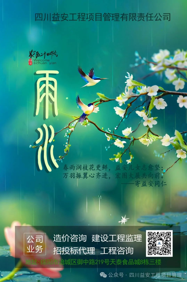时值雨水,天地交泰,万物萌发。值此春意渐浓之际,谨以此寄四川益安同仁:春雨淅沥,润泽嘉木新枝,催绽满庭芳华;正如诸君以赤诚之心浇灌事业之树,令益安事业花繁叶茂。去岁寒暑,诸君以磐石之志淬炼精诚,纵遇风霜亦未改凌云气魄。群鸟齐飞,千翼共展,恰似我益安儿女勠力同心,以整齐步伐踏响奋进鼓点。前路迢迢,春山可望。愿吾辈同仁共执丹心精技,于四川益安绘就宏图长卷;以笃行不辍之姿,续写益安新华章。当此东风...
